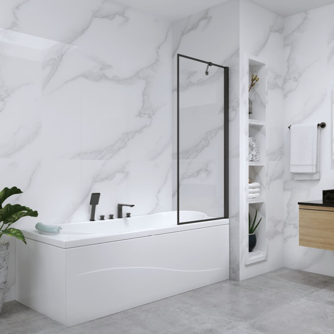 אמבטיון מבנה: דופן קבועה רוחב 66-68 ס"מ. גובה 140 ס”מ. פרזול: שחור מט, מוט תמיכה מעוצב. זכוכית: מחוסמת 6 מ”מ שקופה, עם מסגרת אלומיניום שחור מט. פרופיל: אלומיניום ריבועי מעוצב, בציפוי ANODIZE שחור מט, עמיד בשחיקה.