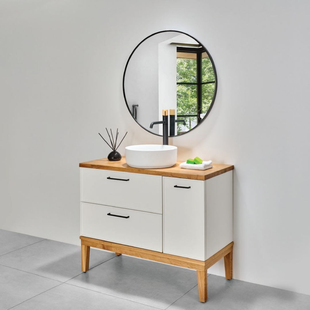 ארון עומד בסגנון כפרי מודרני עם 2 מגירות ודלת או שתיים, חזיתות חלקות עם מסגרת אצבע ורגלי עץ מלא