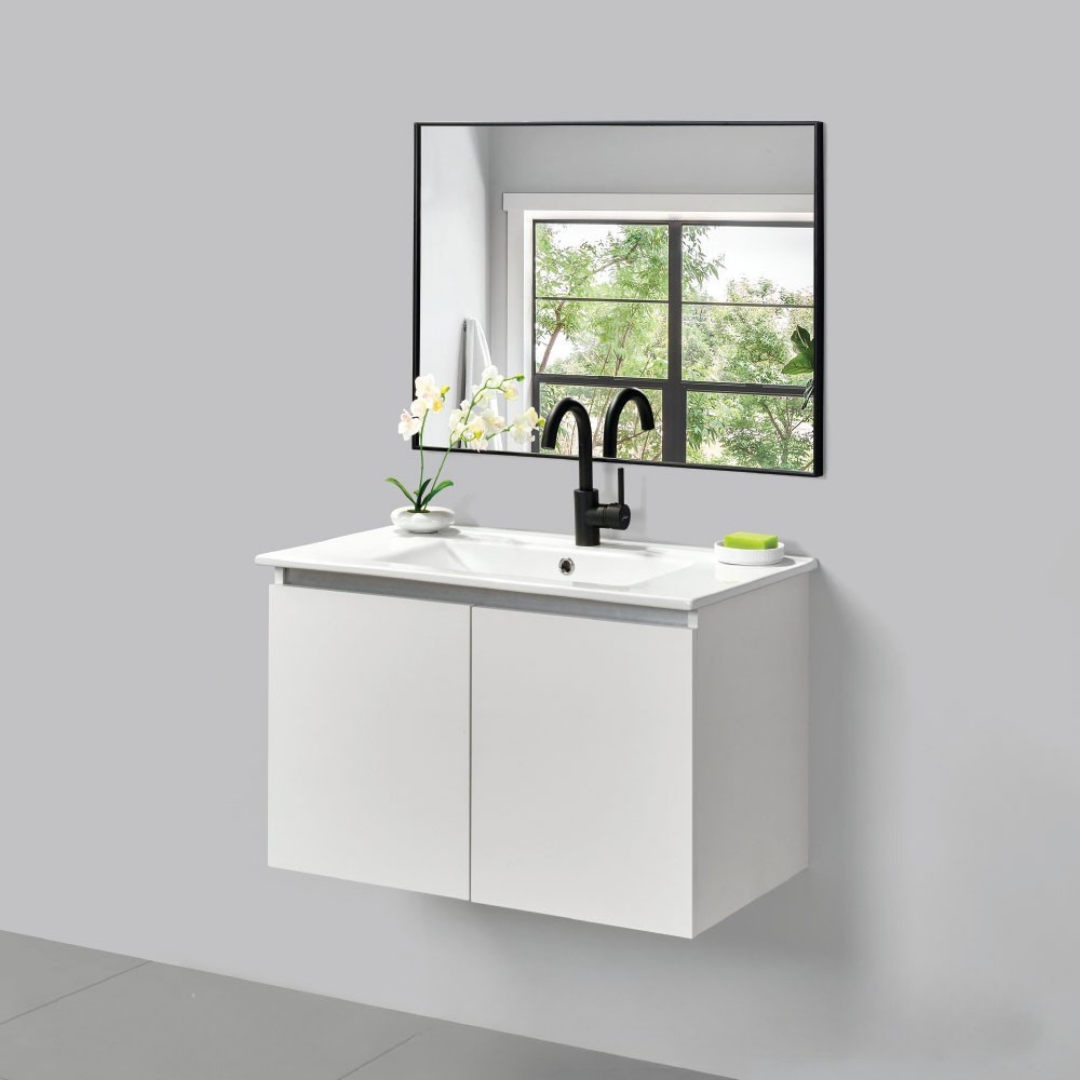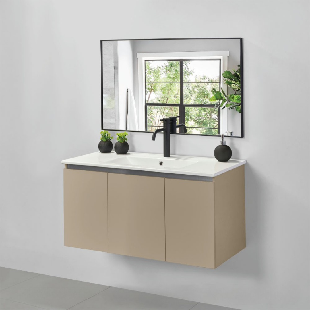 ארון מודרני תלוי עם שתיים או שלוש דלתות חלקות מראה נקי ורציף שמתאים לחללי רחצה בעיצוב עכשווי מגיע עם כיור אינטגרלי עם אפשרות שדרוג כיור/משטח, בחירת גוון ארון.