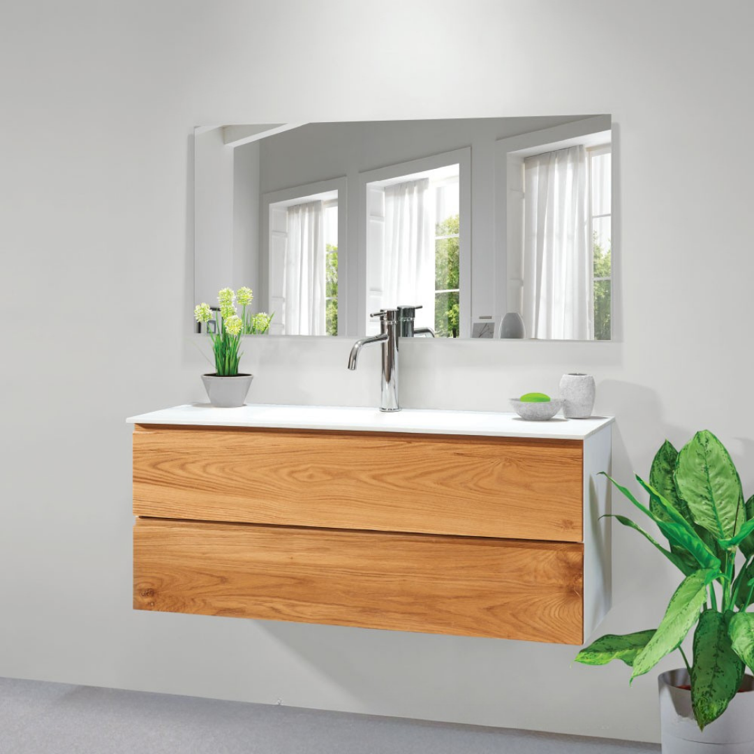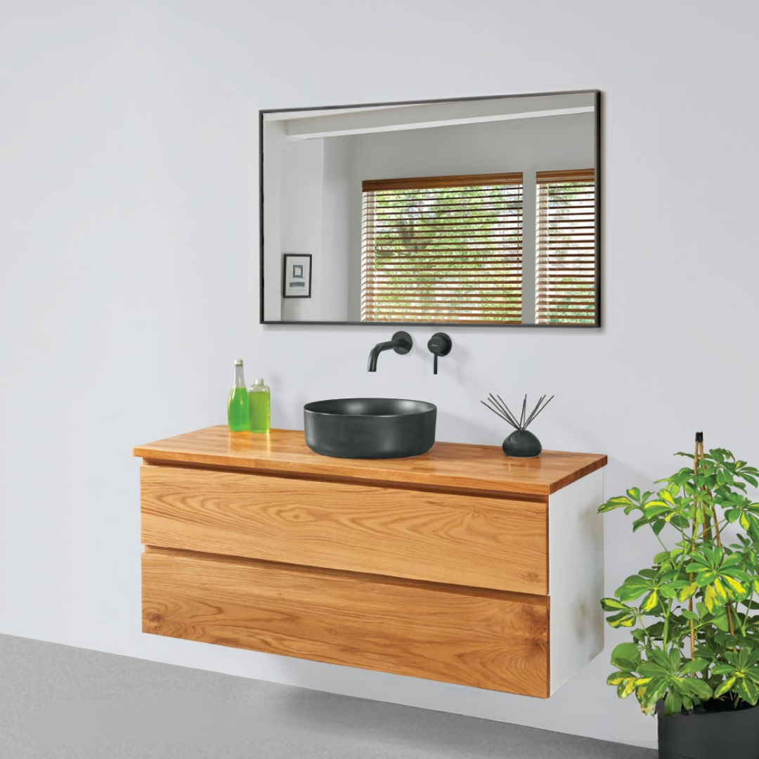 שידת אמבטיה בסגנון טבעי עם חזית עץ מלא ושתי מגירות רחבות