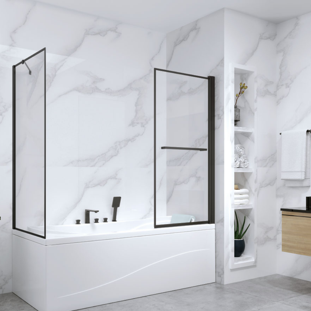 פרזול: שחור מט, צירי HI-PRO עולים בפתיחה ויורדים בזמן סגירה לאטימות מירבית. מוט תמיכה מעוצב, ידית מתלה מגבת, מגבי אטימה.